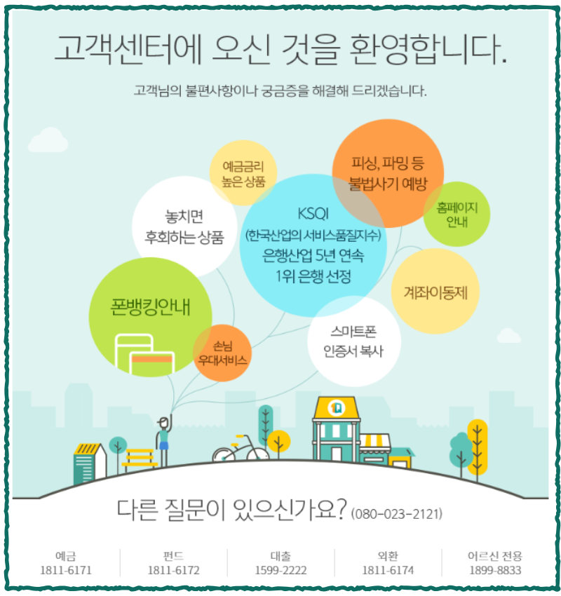 - 예금/외환 상담: 1599-4567 후 1번(예금신규 및 만기 재예치), 2번(청약, 적금신규 및 만기 재예치), 3번(외화환전 및 송금)